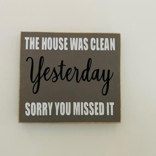 This is a small hand painted gray wood sign that has "The House was clean yesterday. Sorry you missed it" in white vinyl letters on top. "Yesterday" is in black vinyl letters.
